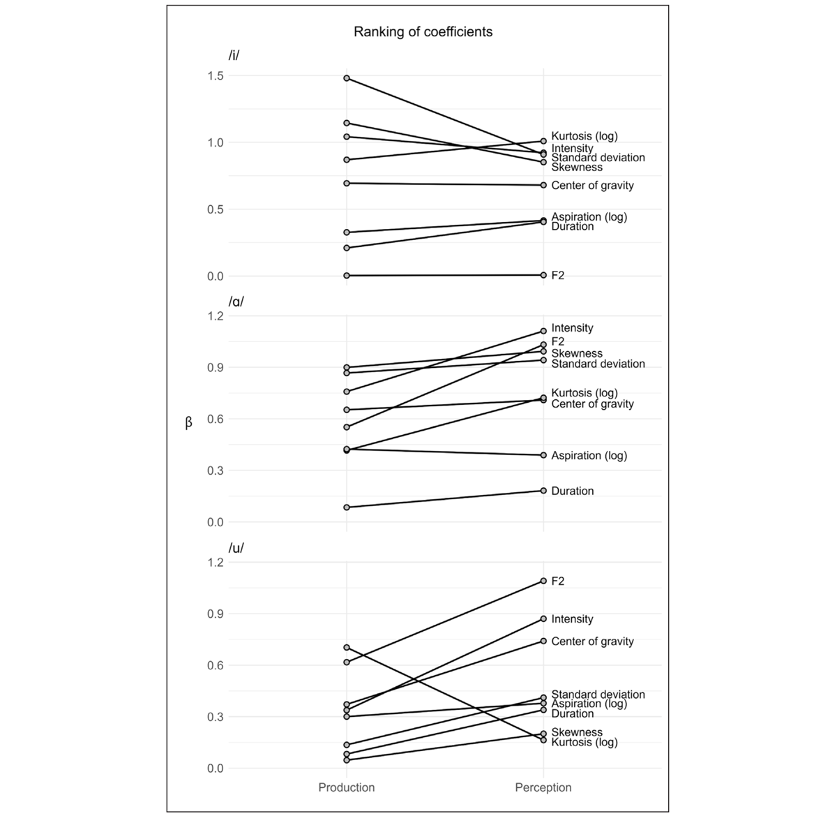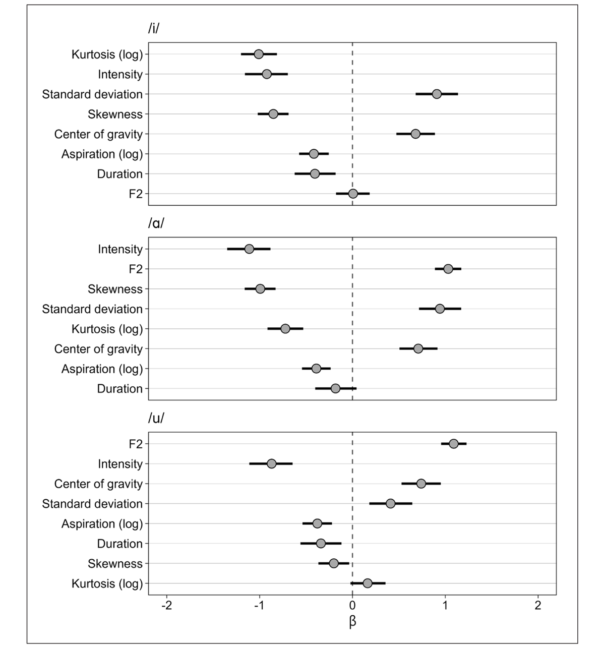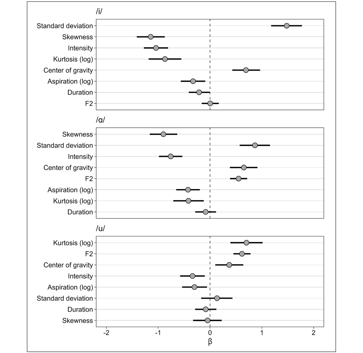 Looking at the overall separability of the different acoustic parameters, we find some patterns despite the variation by vowel context. The parameters that appear to give a reliable separation between /ʃ/ and /ç/ across all three vowel contexts are intensity, center of gravity, and kurtosis. The largest effect magnitudes, however, are found for standard deviation and skewness, but only in the /i/ and /ɑ/ contexts. These two parameters do not appear to separate between /ʃ/ and /ç/ in the /u/ context. F2 has a high ranking before /u/ and is found in the middle of the ranking before /ɑ/, although the effect magnitude in the two contexts are similar. Before /i/, however, F2 appears to give no separation. A further discussion of these context effects will follow in Section 4.2. Common to all three vowel contexts is the finding that aspiration and duration are found towards the bottom of the rankings with relatively small beta weights. We can therefore conclude that these parameters do not contribute notably to the separation between /ʃ/ and /ç/ in production.