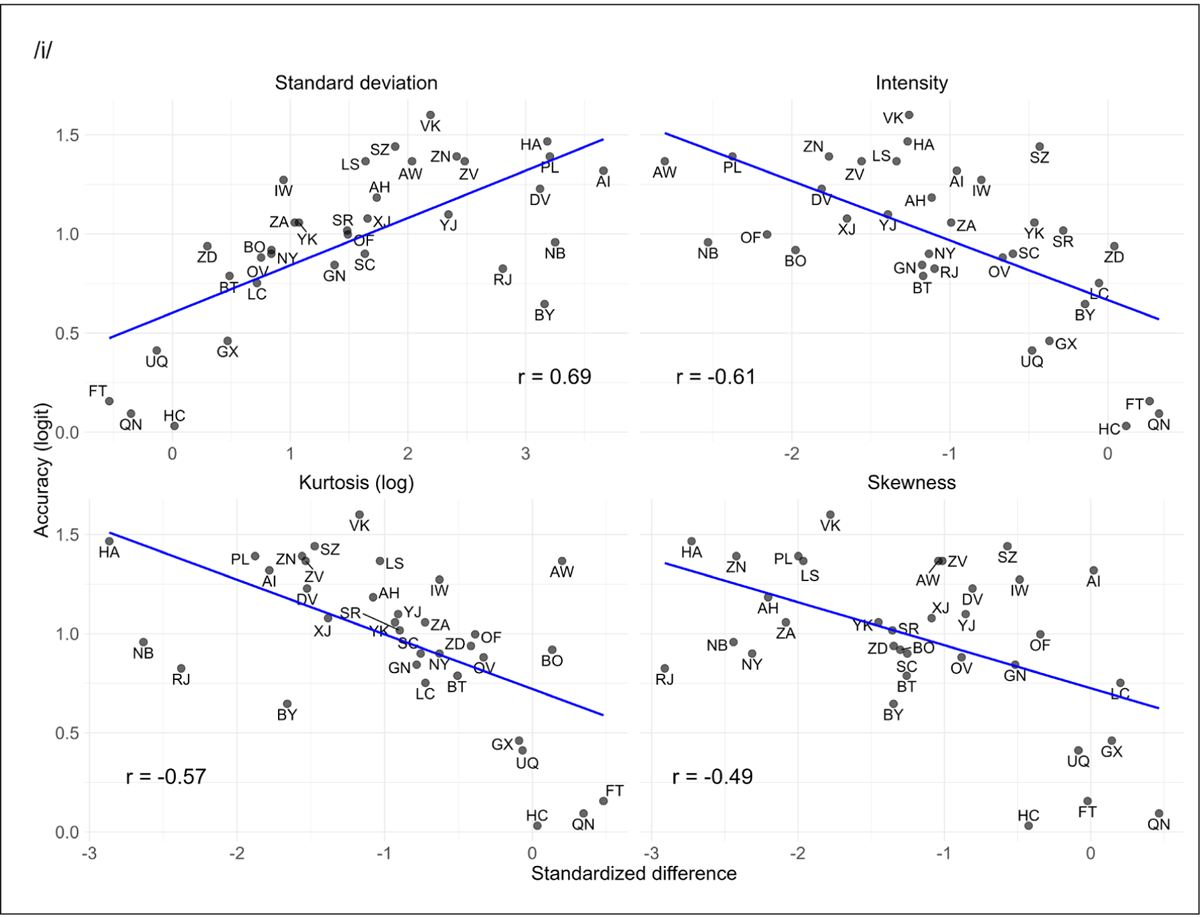 Figure 11 illustrates the relationship between acoustic separation and accuracy in perception for the four parameters which have the strongest correlation with accuracy, all found in the /i/ context. The strongest correlation is found for standard deviation (r = 0.69), followed by intensity (r = –0.61), kurtosis (r = –0.57), and skewness (r = –0.49). In the /ɑ/ and /u/ contexts, the highest correlations were found for standard deviation (r = 0.45) and intensity (r = –0.44). All remaining correlation coefficients were below r = 0.40.
