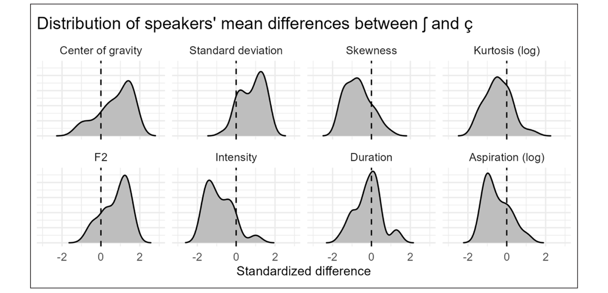 Figure 2 illustrates that for all parameters but duration, a majority of speakers appear to produce a difference between the two fricatives, as indicated by peaks in the distributions left or right of zero. However, we also find a number of speakers close to zero, indicating that certain speakers do not produce a difference between /ʃ/ and /ç/ for these parameters. For duration, on the other hand, a majority of speakers have a mean difference of zero.