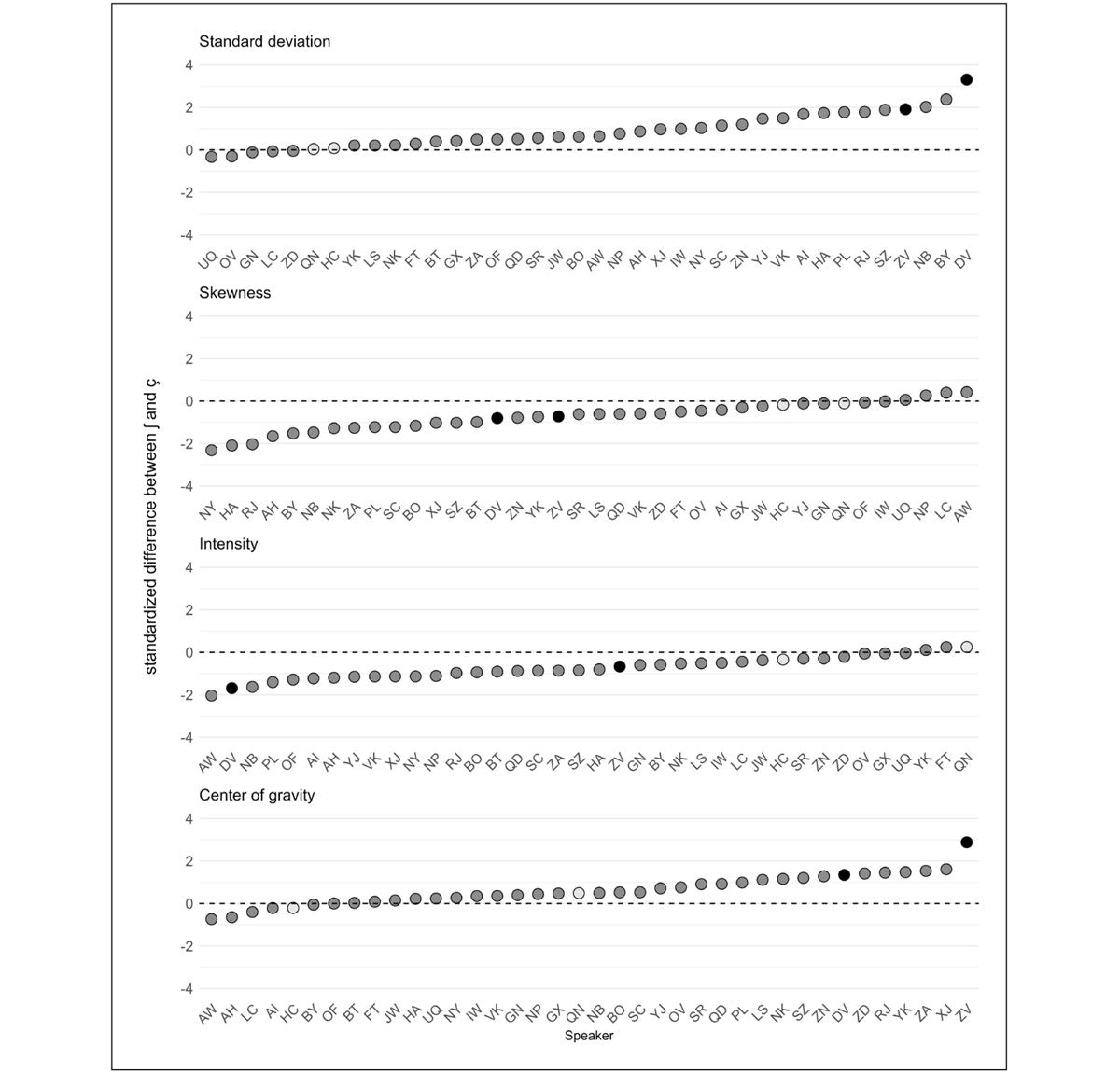 Having identified certain parameters which contribute more to the contrast than others, we can investigate speakers’ mean differences between /ʃ/ and /ç/ for these parameters specifically. Choosing the four parameters which appear to give the largest degree of separation for the three vowel contexts combined, namely standard deviation, skewness, intensity, and center of gravity, we examined speakers’ mean differences. Figure 4 presents the mean difference for each speaker for these four parameters. As in Figure 2 above, speakers found around zero do not have a notable difference for the relevant acoustic parameter, whereas speakers found to have larger positive or negative values produced a difference for this particular parameter. Figure 4 makes it possible to compare speakers’ differences across parameters, and we can observe that for some speakers, we find some consistencies. Speakers QN and HC, for example, have differences close to zero across these parameters. Speakers, DV and ZV, on the other hand, have large differences for two of these four parameters. However, there is also a lot of variation between parameters, and the distributions form continua, making it impossible to establish non-arbitrary boundaries between speakers.