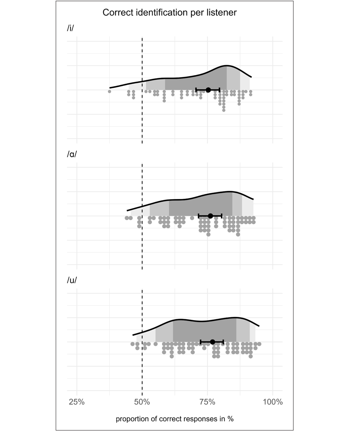 A first point of interest when analyzing the results of the perception study is the level of correct identification of the two fricatives among listeners, as it allows us to gain an understanding of whether the contrast between /ʃ/ and /ç/ is well perceived. This can in turn inform us about the degree of merging among the speakers in our sample.