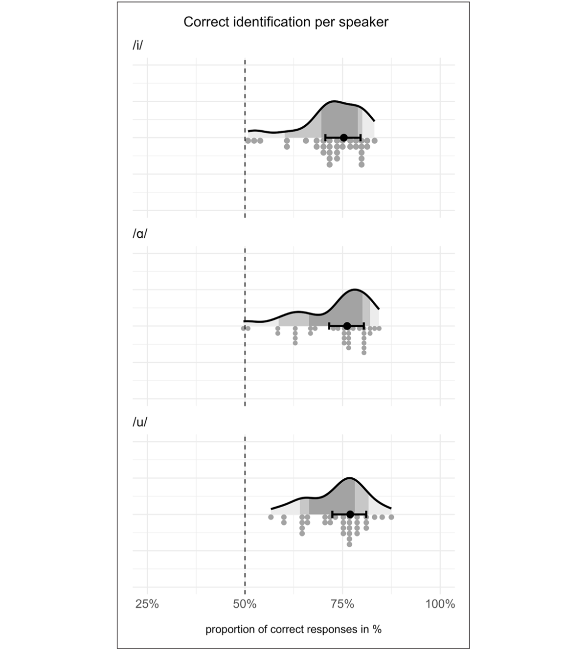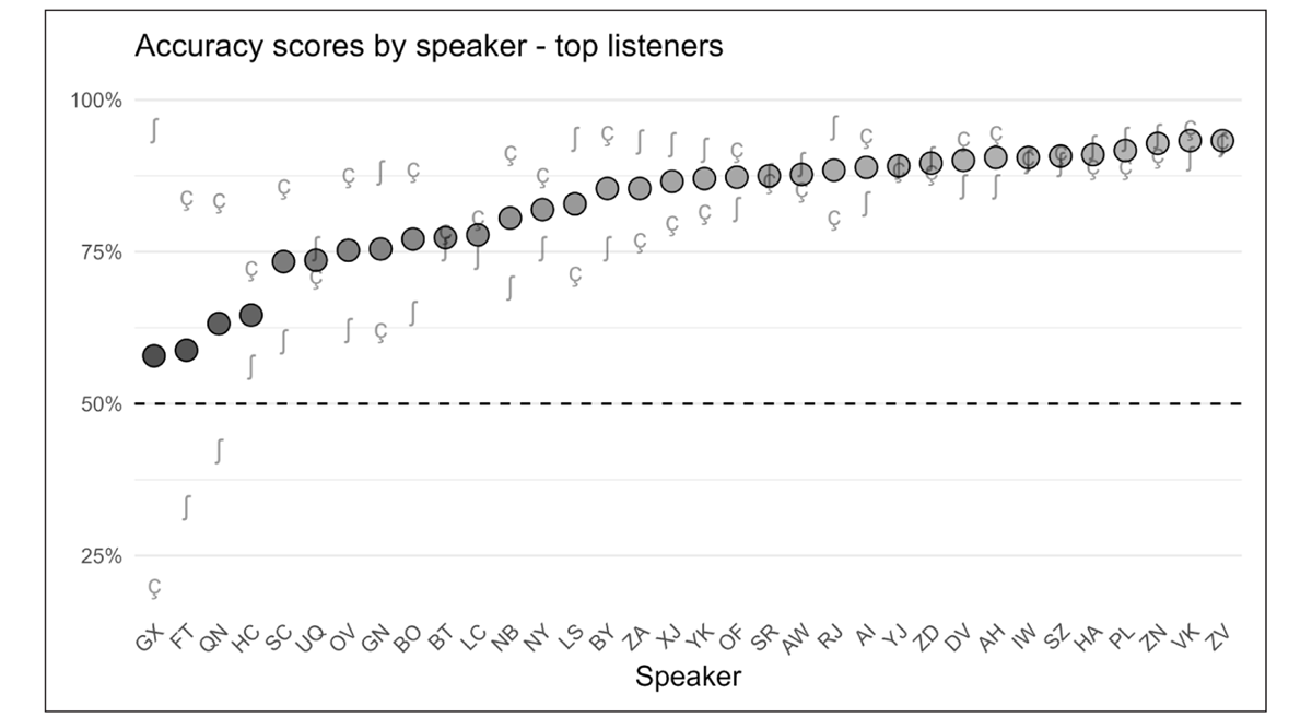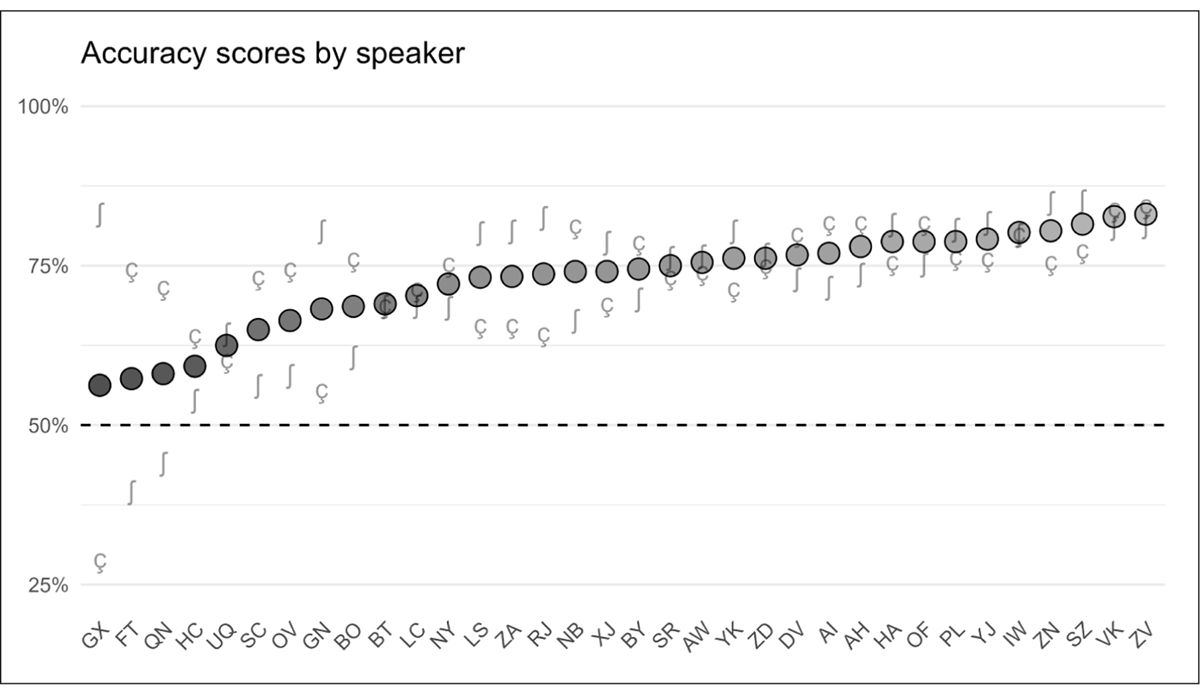 Furthermore, with the exception of the /i/ vowel context, the relationship between speakers’ separation in acoustics and their accuracy score in perception was not particularly robust, indicating that listeners might rely mainly on a combination of the cues measured here or different cues altogether. Nevertheless, certain acoustic parameters, namely standard deviation and intensity, showed a notable correlation with perception, and further research on the contrast between /ʃ/ and /ç/ should therefore investigate the possible interactions between these parameters in particular.